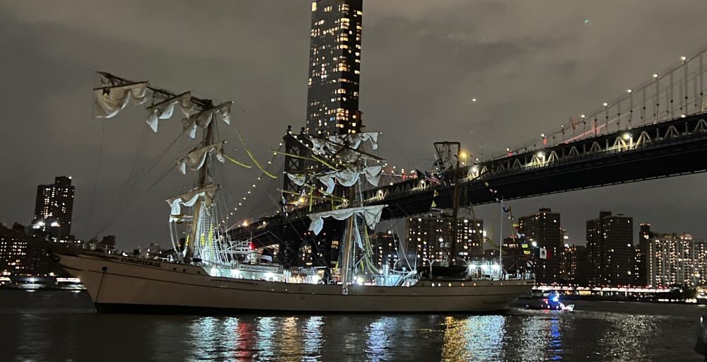 A mast on the ship was captured on video striking the bottom of the historic bridge linking New York City to its next-oldest borough.